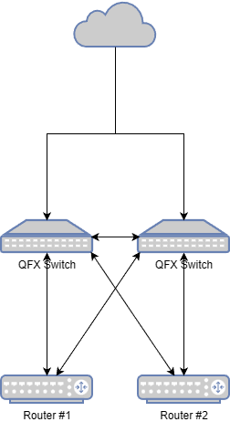 In diesem Architekturansatz werden sämtliche Internet-Carrier- und Transit-Verbindungen über einen vorgelagerten Switch terminiert, der zugleich als zentrales Gateway für das gesamte Netzwerk fungiert. Die nachgelagerten Router sind über kombinierte Layer-2- und Layer-3-Verbindungen angebunden und erhalten jeweils ein dediziertes VLAN, über das die BGP-Sessions mit den Internetdienstleistern aufgebaut und der Internet-Traffic geroutet wird. Auf Empfehlung unseres damaligen Netzwerkpartners fiel die Wahl der Netzwerkausrüstung für die Edge- und Routing-Komponenten auf Juniper. Zum Einsatz kamen Router der Serien MX204 und MX240 sowie QFX-Switches als Edge-Switches. |